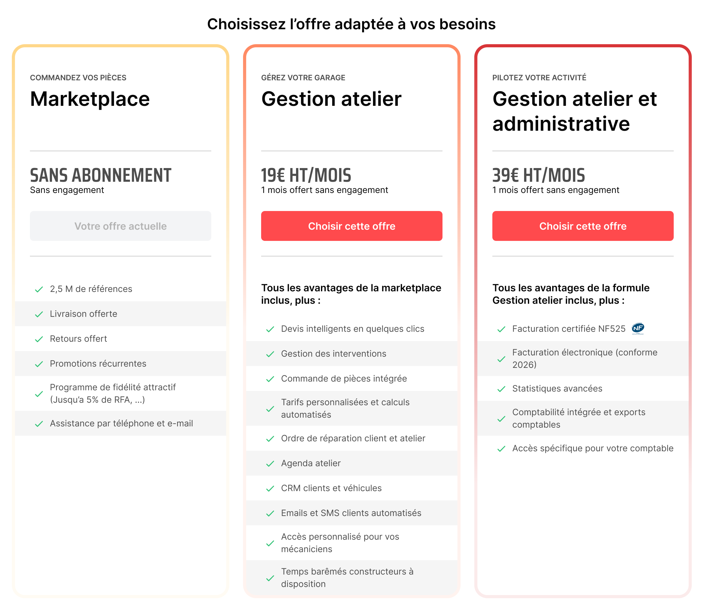 → Offre gestion atelier 19€HT : Devis, OR, commande de pièces, agenda et suivi d'intervention réunis en un seul endroit avec les temps barémés constructeurs et un CRM clients & véhicules intégré.